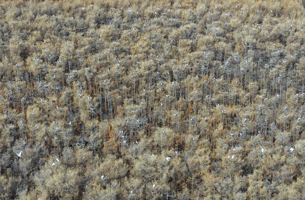 这是4月1日在黑龙江省同江市拍摄的苍鹭群(无人机照片)。新华社发(刘万平 摄)