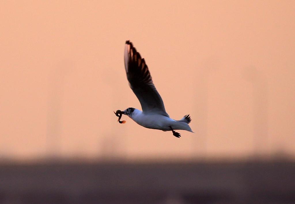 3月30日,在松花江哈尔滨段上空,一只红嘴鸥“携食”飞翔。新华社发(张树 摄)