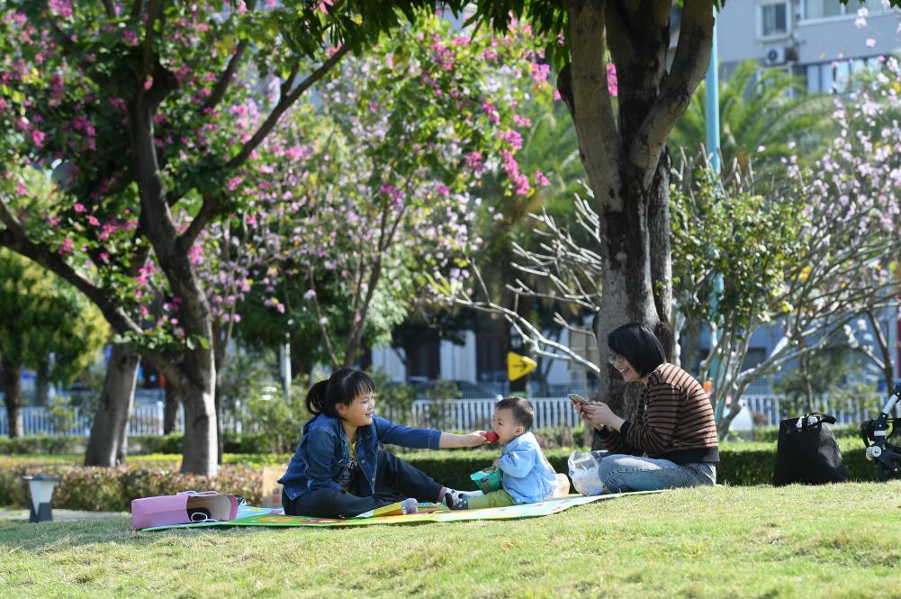市民在南宁市南湖边绿地上享受阳光(2021年2月17日摄)。