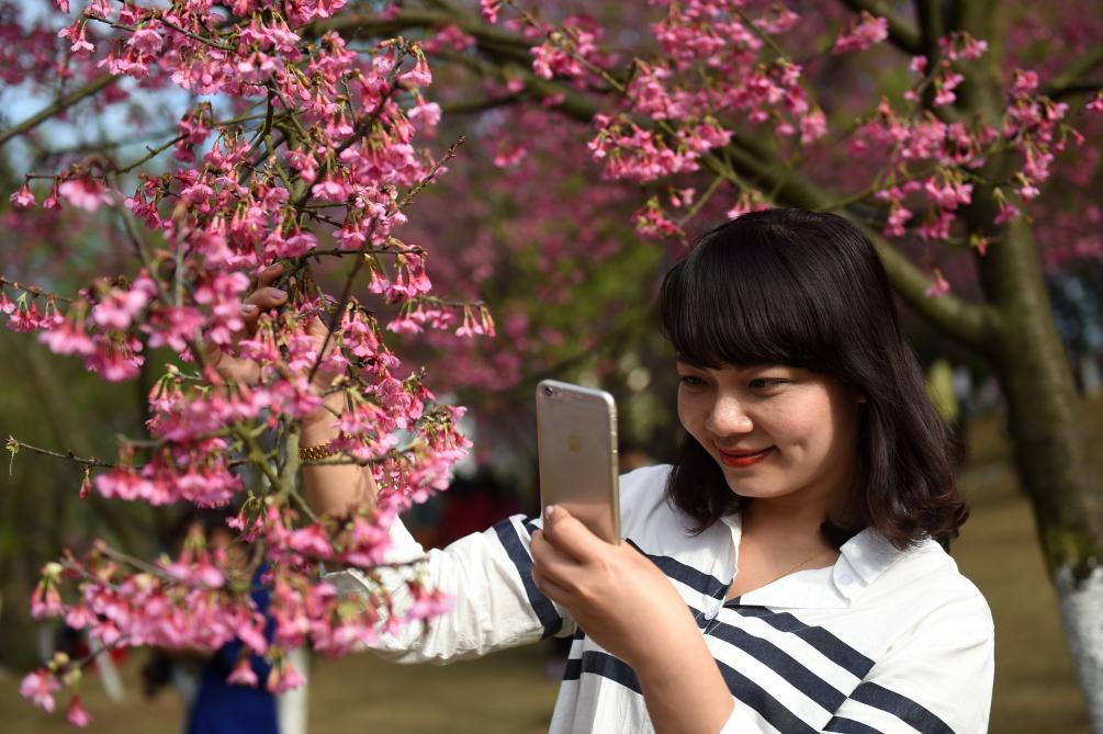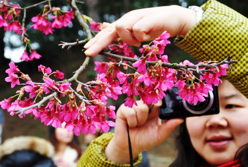 一名游客在南宁市石门森林公园拍摄樱花(2016年2月28日摄)。