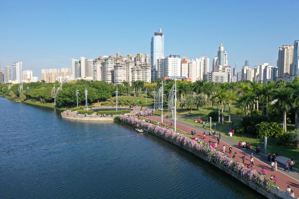 人们在南宁市南湖边游览观光(无人机照片,2021年11月23日摄)。