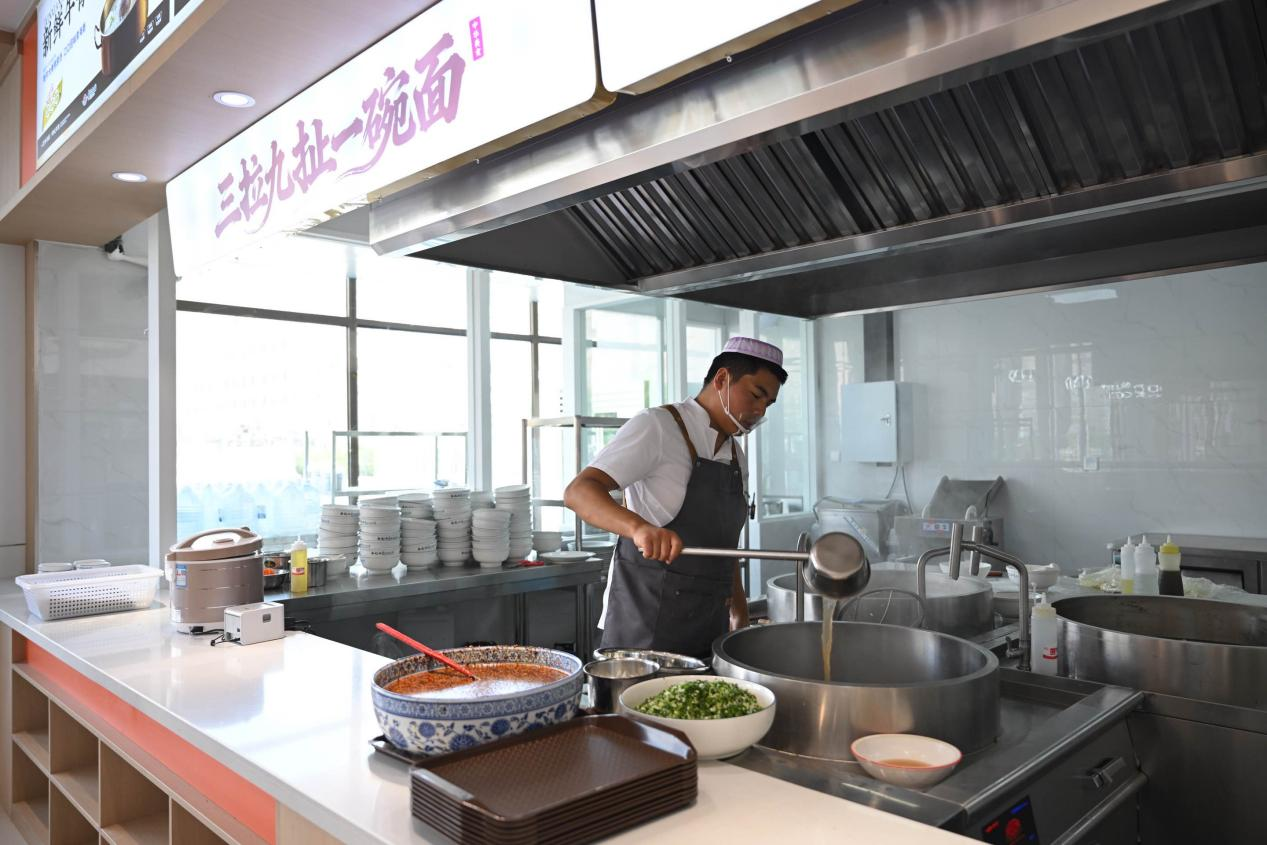 4月14日,拉面师傅在化隆牛肉拉面“3+N”体验店制作拉面。新华社记者 张龙 摄