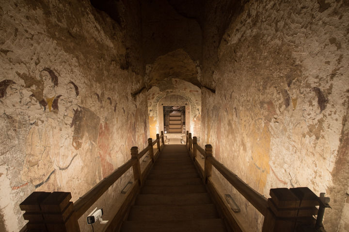 步入展厅,柔和灯光笼罩着玻璃展柜,历经近1500年岁月洗礼的壁画依旧色彩鲜亮。北齐武安王徐显秀墓《宴饮图》《牛车鞍马图》《仪仗队列图》中,朱红衣袍、裘衣纹饰、胡服、波斯锦与西域乐器精彩纷呈,仪卫武士身姿挺拔,骏马昂首扬蹄,定格了北齐别都晋阳的开放繁盛与民族交融。九原岗墓门楼图是全国目前发现的最完整的北朝建筑图像资料,十分罕见。东安王娄叡墓《鞍马游骑图》位列国家首批禁止出境展览文物。