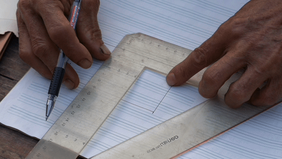 唐以金(右一)在进行古建修复方案讨论。新华社记者 赵欢 摄
