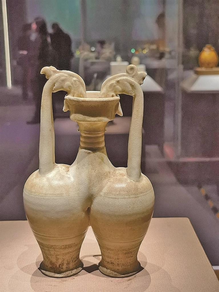 作为日常生活中更为常见的陶瓷器物,亦不乏承载文化交流印记的珍品。比如李静训墓出土的白釉兽面纹双系扁壶,两面图案相同,中间为一兽面,兽口左右各衔一忍冬叶,外圈围绕联珠纹。旁边一只北齐时期的黄釉扁壶,外形与之十分相似,图案是五位西域人物,生动再现了胡腾舞表演场景。专家介绍,此类扁壶为北魏至隋代时期北方地区出现的一种扁壶,椭圆形鼓腹,肩附双系,腹部模印有胡人、驯狮、凤鸟等纹饰,普遍使用联珠纹。一般认为这种具有异域色彩的扁壶原型来源于西亚、欧洲或地中海沿岸的器物,也有学者认为其原型为萨珊波斯金属扁壶。
