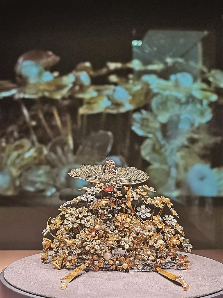展厅入口处,一件手可盈握的金钗,极为精美:金钗以金片为托,两端上卷呈荷叶状。金片上有两个卷环,环上均插着六瓣形金花、三角形金荷叶、穿孔小珍珠等,花蕊处镶嵌珍珠、宝石等,并有金丝编网,串有小珠垂饰。花瓣顶部立着一只金丝嵌珍珠的飞蛾,呈现出“闹蛾扑花”的巧思。