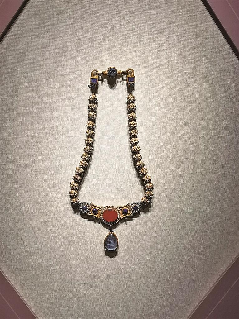 一条俗称为“李静训项链”的嵌珍珠宝石金项链,出土时位于李静训颈部。它由28个金质球形饰组成,球形上各嵌有10颗珍珠。金球分左右两组,每组14个,各球之间由多股金丝编织的链索连接。灯光下,鲜红的鸡血石、宝蓝的青金石交相辉映,再配以洁白的珍珠,在纯金的烘托下,鲜艳夺目,雍容华贵,堪称艺术精品。