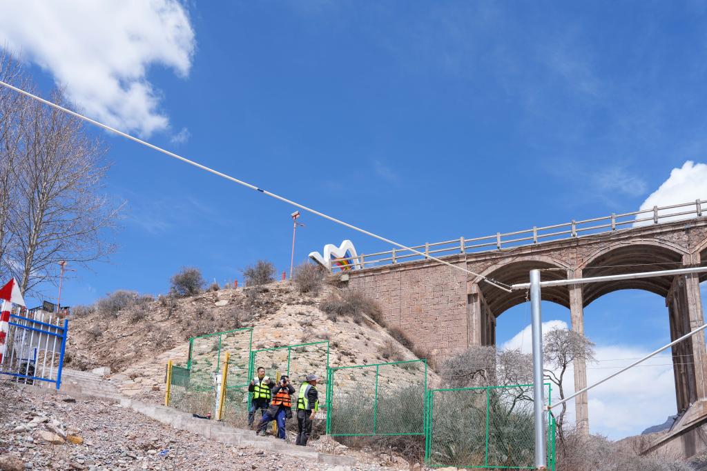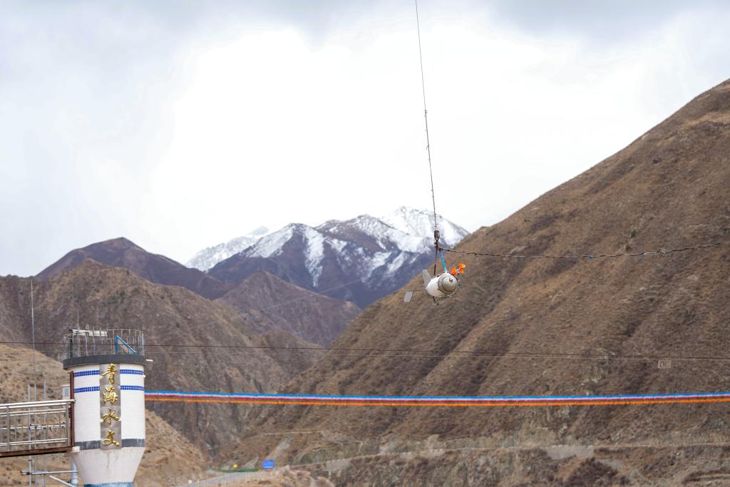 青海省玉树水文水资源测报分中心职工在直门达水文站通过铅鱼进行流量测验。新华社发
