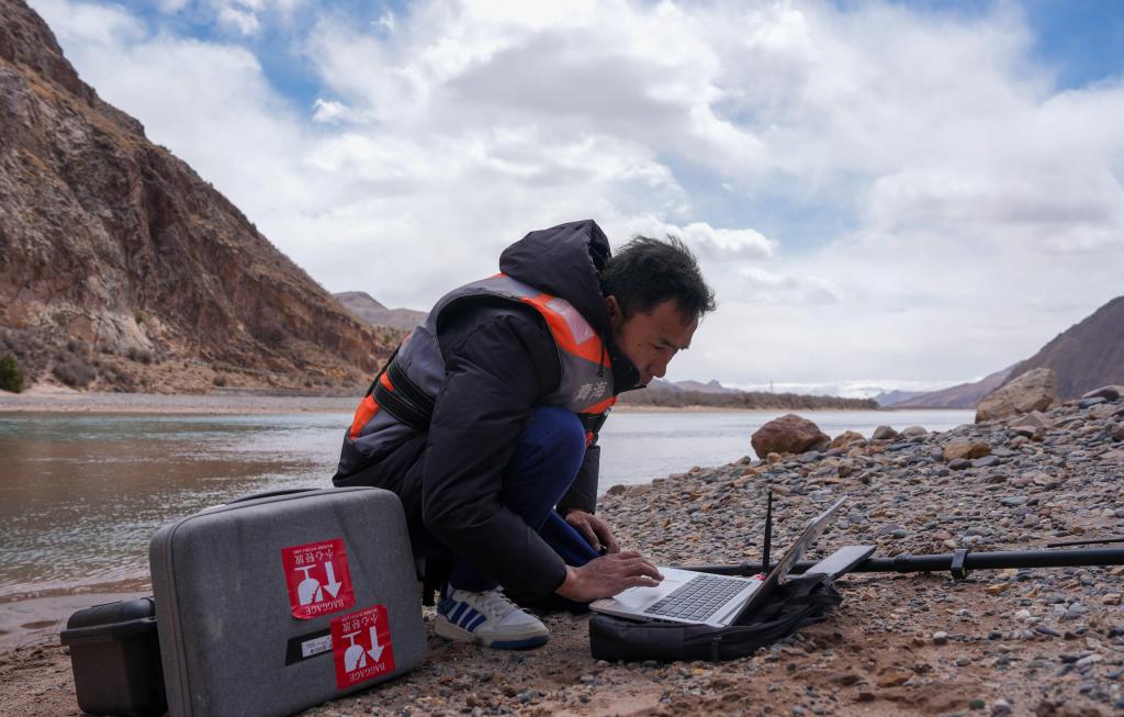 青海省玉树水文水资源测报分中心职工在隆宝滩水文站附近河流作业。新华社发