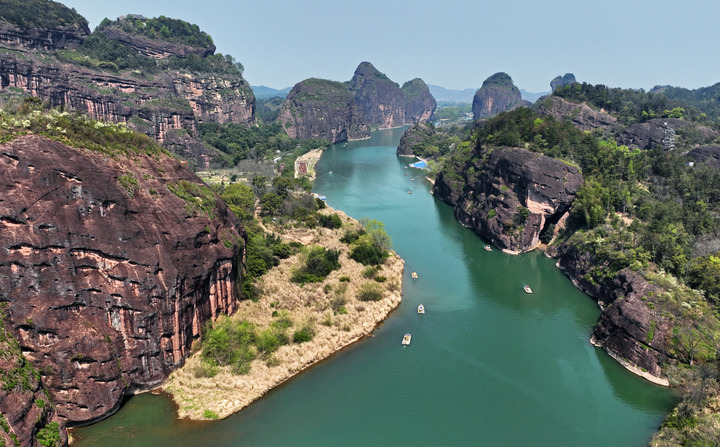 游客乘竹筏游览龙虎山风光。新华社记者 万象 摄
