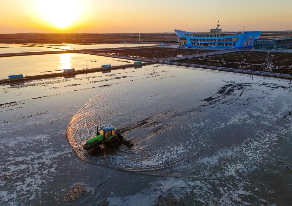 4月18日,在黑龙江省富锦市万亩水稻公园,种植户驾驶农机进行打浆作业(无人机照片)。新华社发(曲玉宝摄)