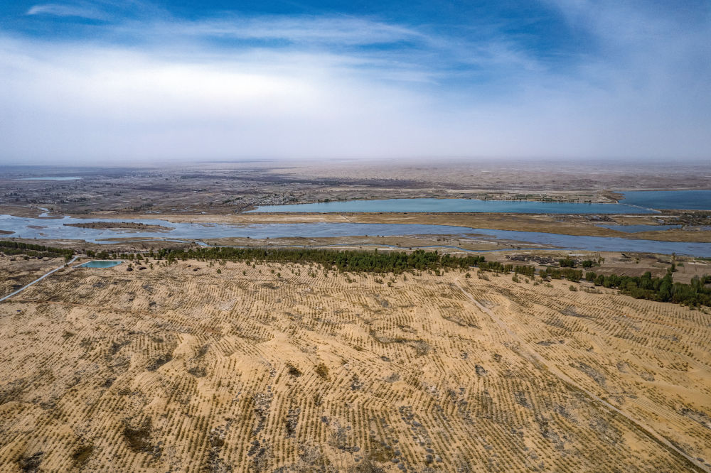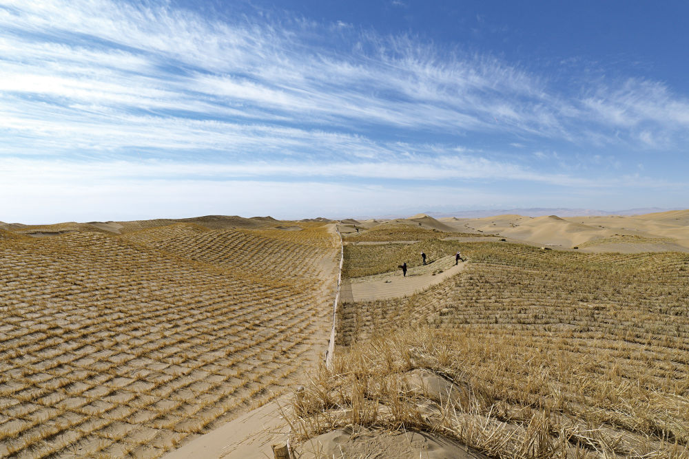 一望无垠的沙海间,错落有致的草方格如镶嵌在大地的棋盘,牢牢锁住流动沙丘。