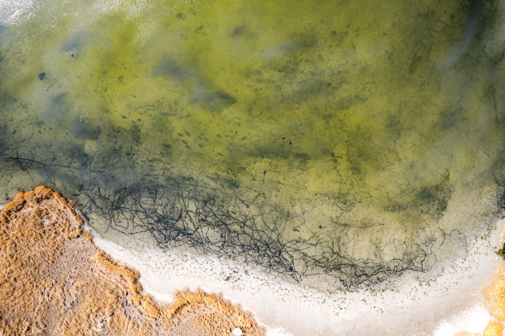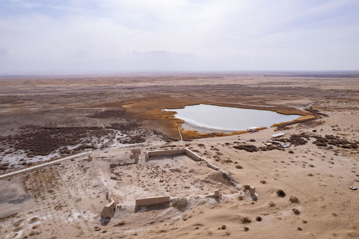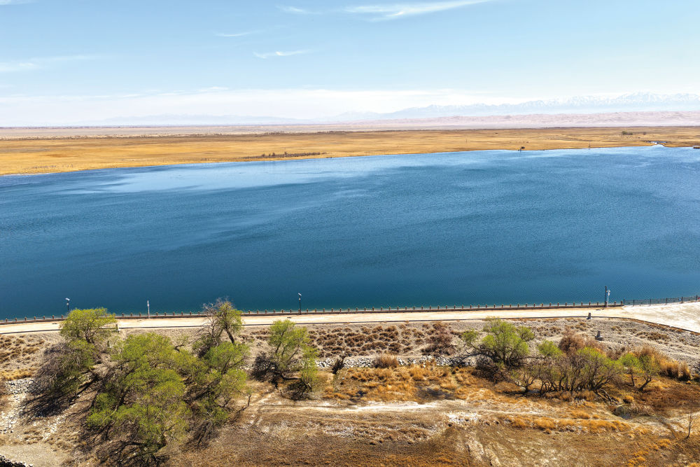 水面以南,是一片茫茫戈壁大漠,碧蓝池水好似连绵沙丘挤出的一滴泪。