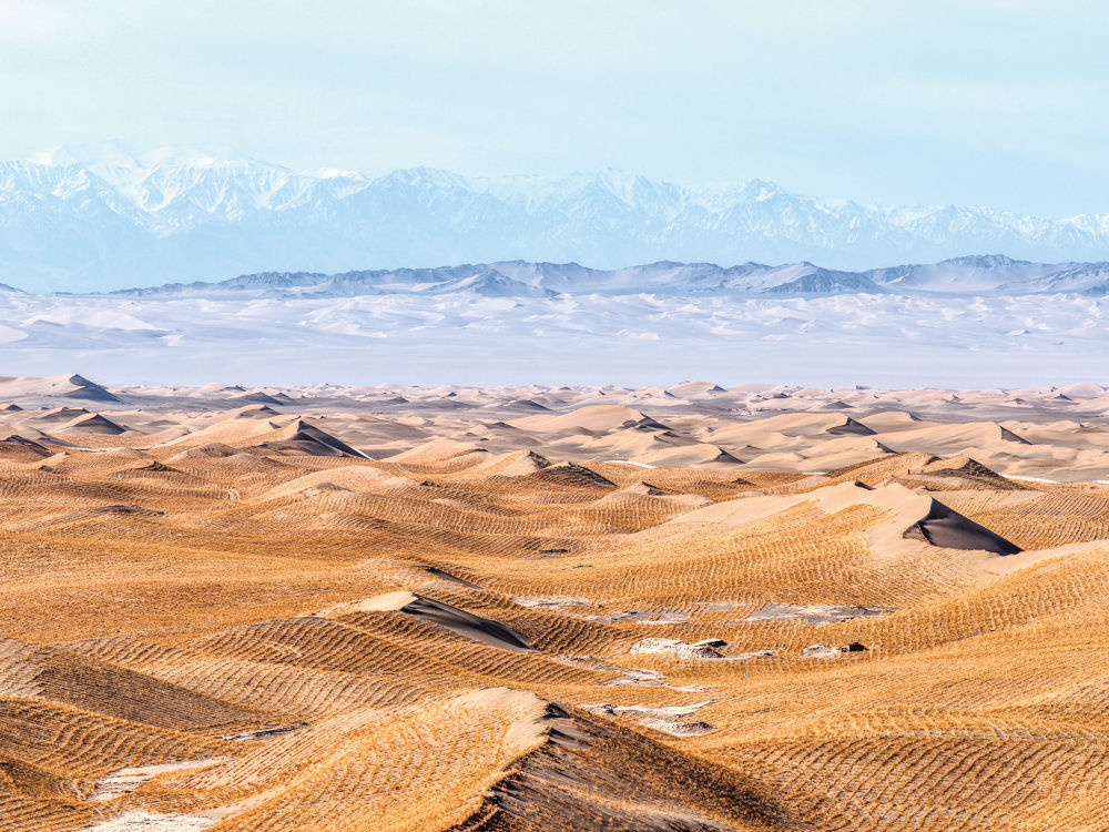 不久前,我们从敦煌出发,从清明到谷雨,经由库姆塔格、巴丹吉林、腾格里沙漠边缘,沿千里风沙线穿越河西走廊。一路所见,色彩斑斓,不仅有黑色的戈壁、褐色的大漠,也有金色的草方格、绿色的草木,更有防止三大沙漠“握手”的绿色“楔子”……