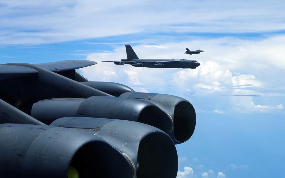 美军B-52轰炸机与印度尼西亚F-16战斗机编队飞行