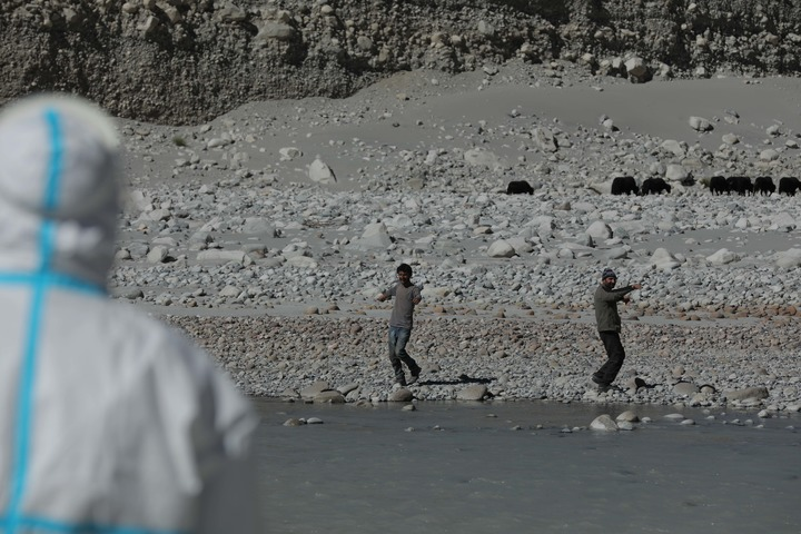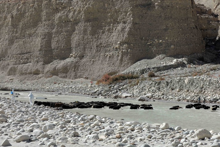10月19日,新疆喀什军分区某边防团塔吐鲁沟边防连官兵和驻地护边员帮助巴方牧民驱赶牦牛过河。 新华社发(姬文志 摄)