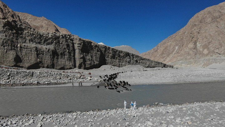 10月19日,新疆喀什军分区某边防团塔吐鲁沟边防连官兵配合驻地单位,协助巴基斯坦吉尔吉特-巴尔蒂斯坦省星峡尔部落牧民的牦牛借道转场。此为传统牧道,因地势险要、河流阻隔,巴方牦牛每年春冬两季转场都要借助我方道路2公里。为保障巴方牧民牲畜安全,边防官兵和护边员还提前进行了实地线路勘察。经过5个小时,巴方300多头牦牛顺利出境,转至冬季希尔利克牧场。