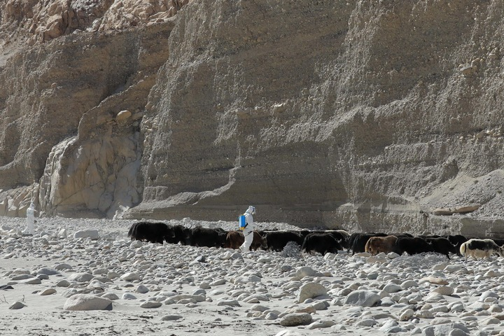 10月19日,新疆喀什军分区某边防团塔吐鲁沟边防连官兵和驻地护边员帮助巴方牧民牦牛转场,我方防疫人员全程跟进消毒。 新华社发(姬文志 摄)