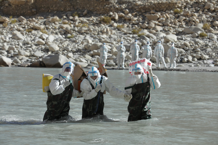 10月19日,新疆喀什军分区某边防团塔吐鲁沟边防连官兵和驻地护边员蹚河为巴方牧民赠送御寒物资和食物。 新华社发(姬文志 摄)