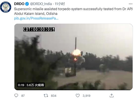 DRDO发布的“超音速导弹辅助鱼雷发射系统”试射画面