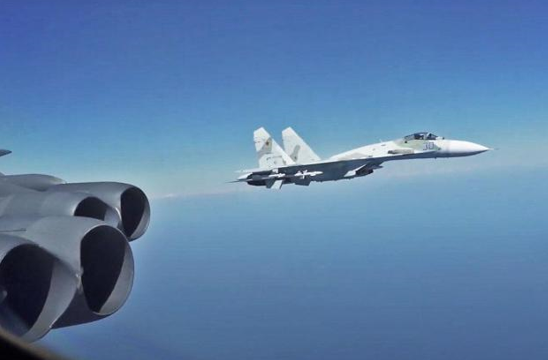今年,美国B-52H战略轰炸机靠近俄罗斯国土进行核演习,引发俄罗斯抗议。图为俄罗斯战机拦截美国B-52H。