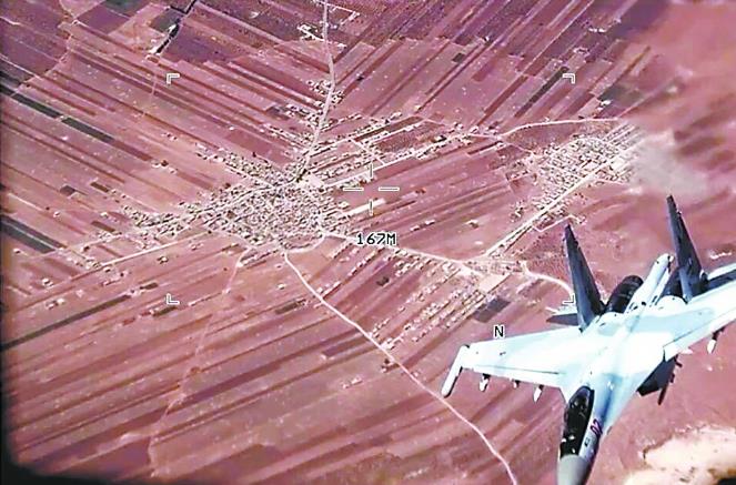 当天俄战机释放带降落伞的专用干扰弹的画面。