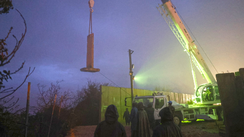 施工队员夜间吊装T型防护墙