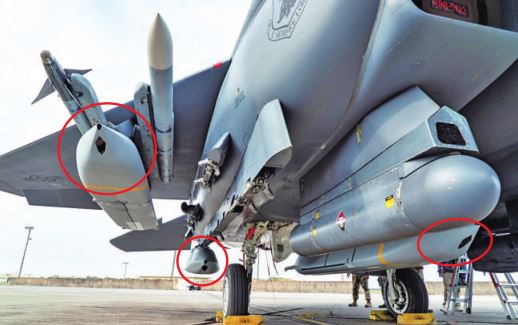 美军F-15E战斗机挂载增程型AGM-158B导弹(图中红圈内)。