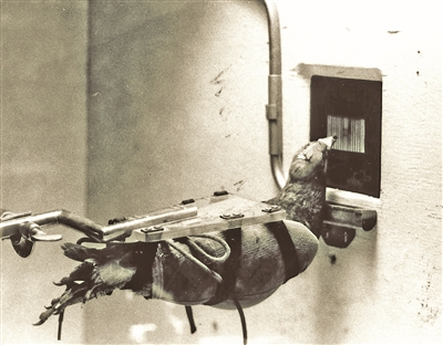 仔细看上面这张图,一只鸽子被人用皮筋轻轻地捆绑在支架上,仅有头部可以自由转动。鸽子的嘴上套着一个特殊的装置,通过有规律的啄击面前黑色屏幕上的图案,似乎正在进行某项实验。这究竟是怎么回事呢?