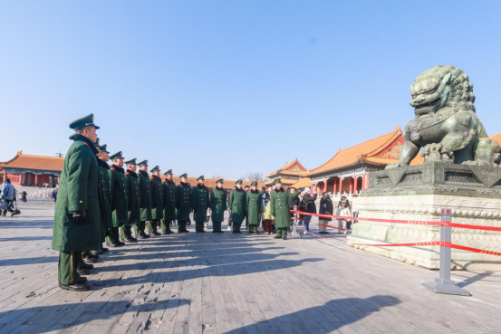 在故宫博物院,新兵们整齐列队,与庄严的紫禁城合影留念。