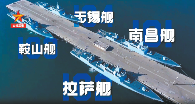 南昌舰等4艘055型驱逐舰近日“同框”的视频截图画面 (央视军事)