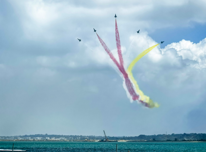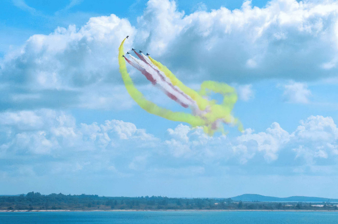 碧海蓝天之间,战鹰诗意起舞。抵达表演空域后,6架歼-10表演机率先进行六机超密集编队通场,拉出象征中新两国国旗颜色的红、黄、白三色彩烟低空掠过海面,六道彩色航迹犹如彩虹一般,勾勒出优美多姿的轨迹。随后,五机、四机、双机、单机等特技动作有序衔接,编队整齐划一、动作流畅紧密。
