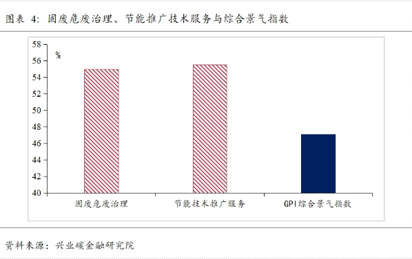 分行业来看,1月政策推动固体废物和危险废物处理领域的规范化发展。1月21日举行的国新办新闻发布会上,工信部表示将聚焦废旧动力电池、废旧光伏组件等新兴固体废物,加快健全法规政策,完善回收和综合利用体系,促进安全高效循环利用;全国电动自行车安全隐患全链条整治工作专班印发《电动自行车锂离子电池回收利用体系建设指南》,以加快建设电动自行车锂离子电池回收利用体系;工信部等六部门联合发布实施《赤泥综合利用行动方案》,以推动1、形成赤泥(以铝土矿为原料生产氧化铝过程中产生的固体废弃物)综合利用量效齐增的可持续发展格局。政策出台推动固废危废治理行业景气度提升,1月GPI调研结果显示,固废与危废治理行业景气指数较上月增长了3.1个百分点,维持高位运行,与固废板块股票走势展现出一定同步性(见图表5)。此外,国家发展改革委等部门印发《绿色技术推广目录(2024 年版)》(发改环资〔2024〕1812 号),遴选了节能降碳产业、环境保护产业、资源循环利用产业、能源绿色低碳转型、生态保护修复和利用、基础设施绿色升级、绿色服务等7大类产业112项先进绿色技术。1月GPI调研结果显示,节能技术推广服务行业景气指数逆势增长至扩张区间。