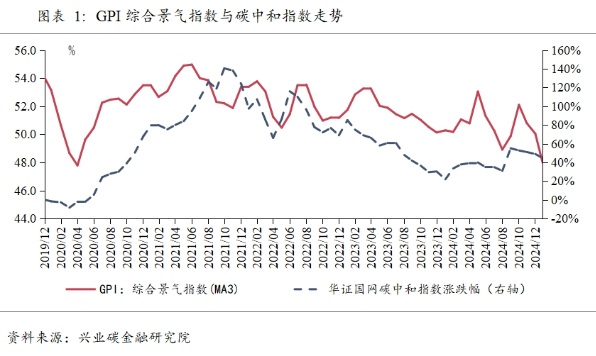 2025年1月GPI指数为47.1%,较上月小幅回调1.8个百分点。受春节假期影响,本月绿色产业景气回落,预期指数也有所下降,较上月下跌了5个百分点。1月绿色产业综合景气指数仍维持在临界点以下,与碳中和指数走势呈现出较高同步性,1月华证国网碳中和指数下跌3.4%。从历史走势来看,GPI综合景气指数走势与碳中和指数涨跌幅具有较强一致性(见图表1)。