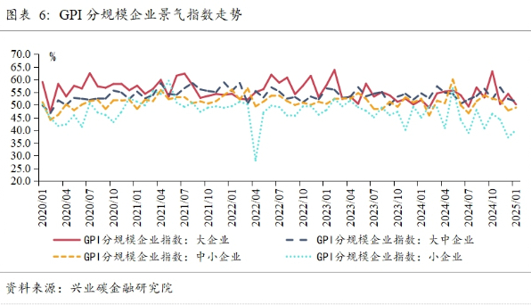 分企业规模来看,本月GPI调研结果显示,虽然绿色产业整体景气回落,但小型企业、中小型企业景气指数分别较上月抬升2.9个和1.1个百分点。大中型、大型企业景气指数虽较上月分别回落1个和4.2个百分点,但景气指数仍处于扩张区间,韧性凸显。(兴业研究 徐金、方琦、钱立华)