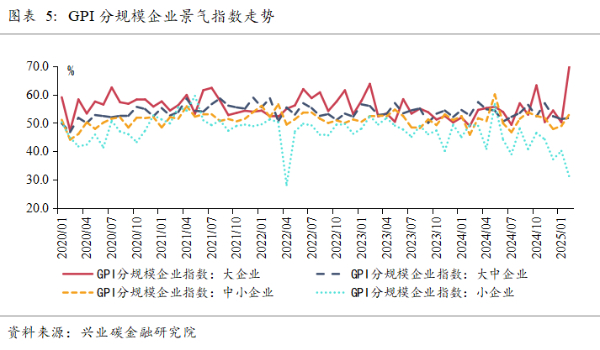 2025年2月GPI综合景气指数为41.7%。受春节假期和2月份工作日较少等因素的影响,2月GPI综合景气指数较上月下降5.4个百分点,仍处于收缩区间。此外,本月调研结果显示,绿色产业预期指数也有较大幅度下降。