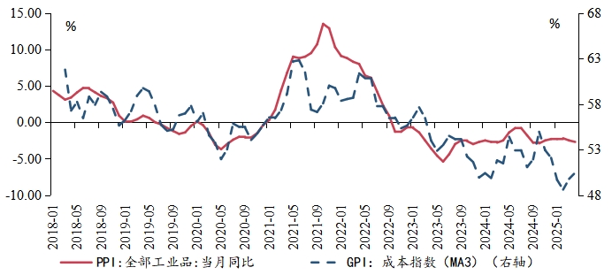 GPI成本指数与PPI当月同比