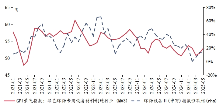 分行业来看,不同绿色细分行业景气分化程度加深,政策驱动绿色环保设备材料制造行业、水利设施建设行业景气指数高位运行。5月23日,国务院常务会议审议通过《制造业绿色低碳发展行动方案(2025-2027年)》,进一步加快推动了我国制造业向绿色低碳方向转型。5月GPI调研结果显示,绿色环保设备材料制造行业景气升至54.2%,重回扩张区间。近期,绿色环保设备材料制造行业景气指数的变化趋势与环保设备板块股票指数涨跌走势也展现出一定同步性。5月15日,中共中央办公厅、国务院办公厅印发《关于持续推进城市更新行动的意见》,其中提出“加快城市燃气、供水、排水、污水、供热等地下管线管网和地下综合管廊建设改造”“推动城市供水设施改造提标”“构建完善的城市防洪排涝体系”等。5月GPI调研结果显示,供水与水利设施建设行业景气指数升至54.5%。