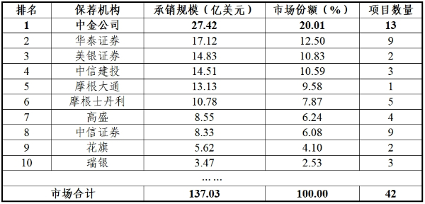 从港股IPO保荐机构口径看,中金公司作为行业“排头兵”,今年已成功保荐13单,承销规模27.42亿美元,均排名市场第一。中金公司在三花智控、海天味业、派格生物、元光科技、博雷顿等多单项目的承销比例均超过70%,优于高盛、摩根士丹利等外资投行。华泰证券的承销规模紧随其后,保荐项目承销规模约17.12亿美元,市场份额12.50%;中信建投和中信证券表现亮眼,保荐项目承销规模市场份额分别达10.59%、6.08%。
