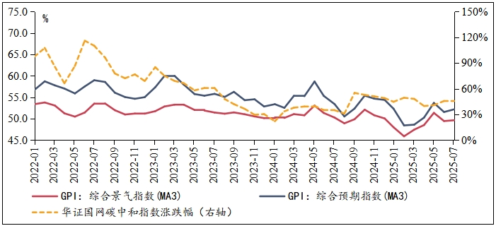 2025年7月GPI指数为50.92%,较上月提高3.2个百分点。7月绿色产业景气度整体回暖,GPI综合景气指数重回临界点之上,预期指数环比提升7.66个百分点至56.84%,创一年来新高。7月华证国网碳中和指数较上月末上涨1.68%,近期GPI综合景气指数走势与碳中和指数涨跌走势显示出较高一致性。