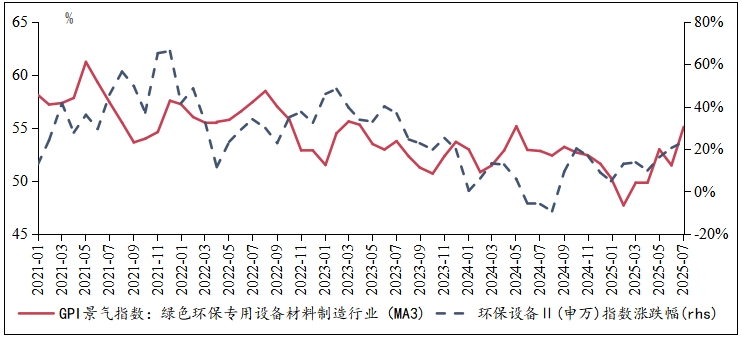 图表5:绿色环保专用设备材料制造行业景气指数与环保设备板块股票指数涨跌走势