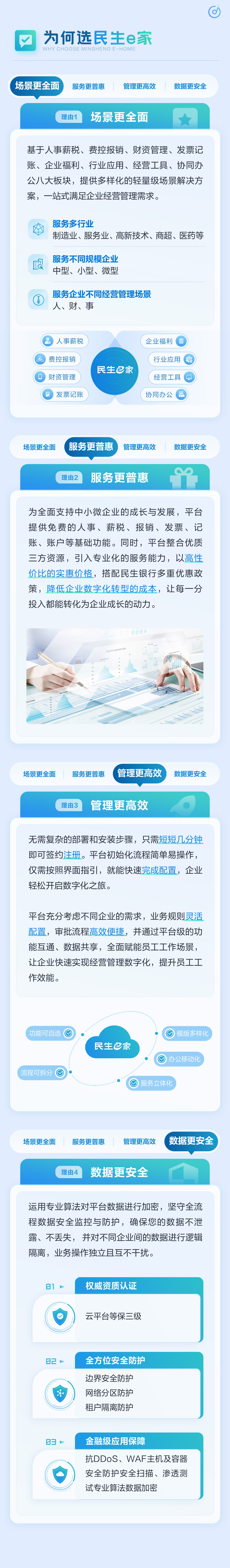 “民生e家”集人事薪税、财资管理、费控报销、发票记账、经营工具、协同办公、企业福利、行业应用等功能于一体,以金融级安全、极简化操作、超流畅体验为支撑,解决企业经营痛点,为企业提供数字化转型综合解决方案。