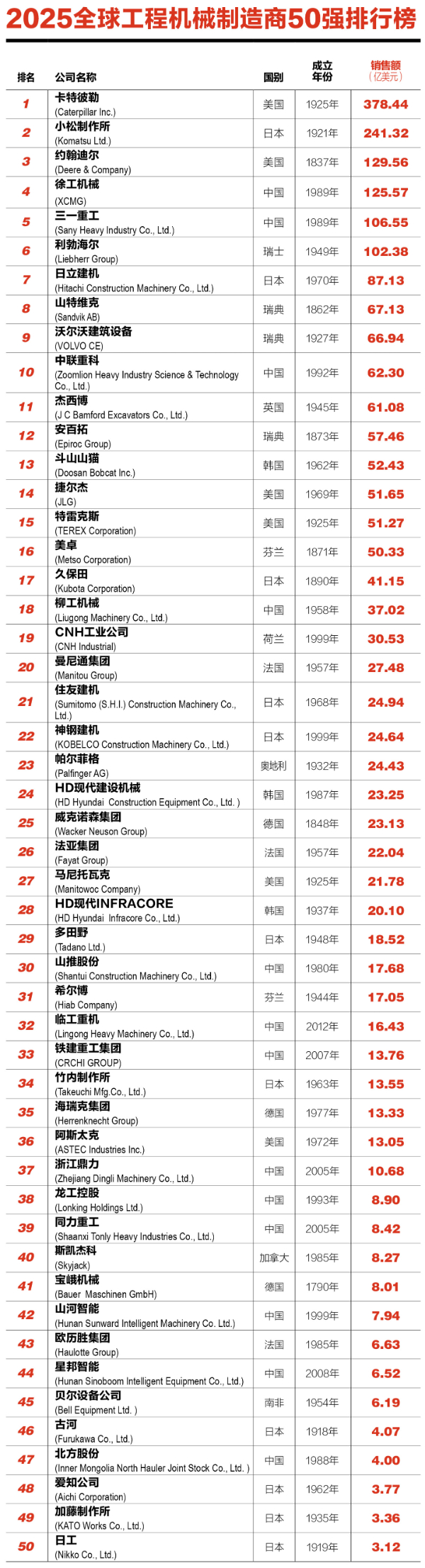 9月9日,2025全球工程机械制造商50强榜单发布。
