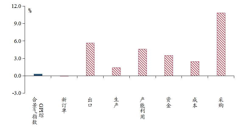 从分项指数来看,9月调研结果显示,需求方面,新订单指数较上月持平,仍处于扩张区间,出口指数环比提高5.7个百分点,创一年来新高;供给方面,生产指数和产能利用指数分别较上月提高1.4和4.6个百分点,均落于临界点之上,并且9月绿色产业采购力度加大,采购指数环比抬升了10.8个百分点。资金周转方面,资金指数较上月提高约3.5个百分点,扩张持续。成本方面,成本指数较上月提高了2.5个百分点,成本压力有所抬升,“主要原材料价格上涨”“运输成本上涨”“劳动力供应不足与成本上涨”为受访企业成本压力增大的主要原因,但总体来看,成本指数仍处于历史相对低位,近期PPI同比变化与成本指数走势较为一致。