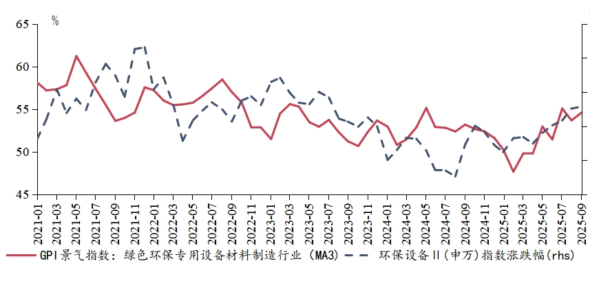 9月政策推动绿色环保专用设备材料制造、可再生能源与新能源发电行业景气度回暖。9月22日,国家能源局等部门联合发布《关于推进能源装备高质量发展的指导意见》,支持能源装备绿色高端发展;9月12日,国家发展改革委、国家能源局印发《关于完善价格机制促进新能源发电就近消纳的通知》,旨在推动新能源实现更高水平的就近消纳。9月GPI调研结果显示,绿色环保专用设备材料制造、可再生能源与新能源发电行业景气指数分别环比升高5.5和6.3个百分点,均落于扩张区间。此外,近期绿色环保专用设备材料制造行业景气指数与环保设备板块股票指数的涨跌走势较为同步。