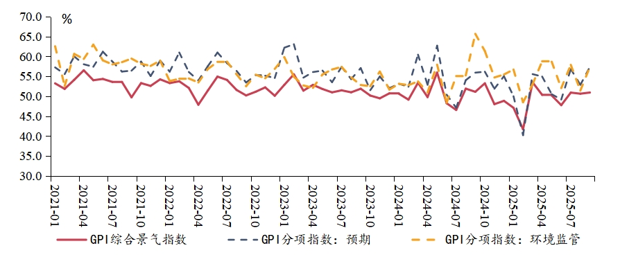 2025年9月GPI指数为50.94%,较上月小幅提升0.3个百分点。9月24日,中国宣布新一轮国家自主贡献,开启应对气候变化新征程:到2035年,中国全经济范围温室气体净排放量比峰值下降7%-10%,力争做得更好;非化石能源消费占能源消费总量的比重达到30%以上,风电和太阳能发电总装机容量达到2020年的6倍以上、力争达到36亿千瓦,森林蓄积量达到240亿立方米以上,新能源汽车成为新销售车辆的主流,全国碳排放权交易市场覆盖主要高排放行业,气候适应型社会基本建成。政策推动下,9月调研结果显示,预期指数和环境监管指数分别较上月抬升了4.5和6个百分点,且均处于荣枯线之上。