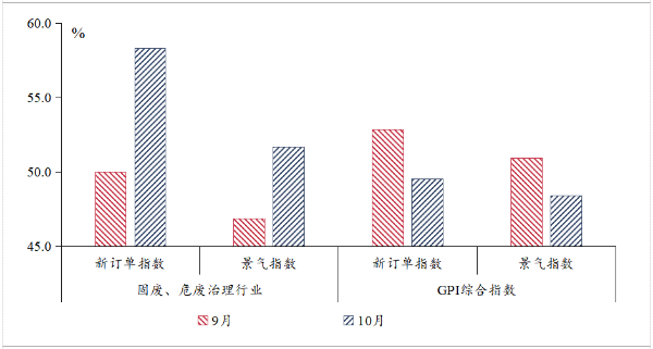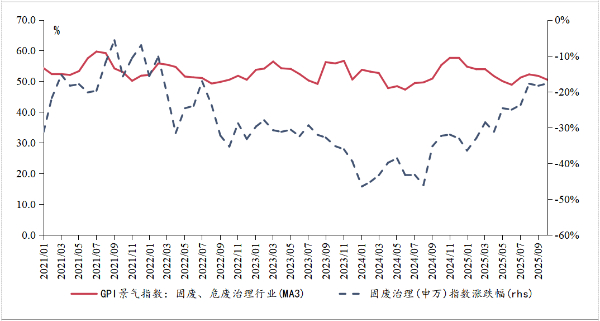 分行业来看,10月政策推动固体废物和危险废物处理行业规范化发展。为贯彻《中华人民共和国环境保护法》《中华人民共和国固体废物污染环境防治法》等法律法规,深化废弃电器电子产品处理环境管理要求,生态环境部组织对《废弃电器电子产品处理污染控制技术规范》(HJ527-2010)进行修订,于10月14日发布《废弃电器电子产品处理污染控制技术规范(征求意见稿)》并公开征求意见。该标准规定了废弃电器电子产品在贮存、拆解、利用和处置过程中的污染控制和环境管理要求。政策推动固废与危废治理行业景气度显著提升,10月GPI调研结果显示,固废与危废治理行业景气指数较上月提高4.8个百分点,重回荣枯线之上,与固废板块股票走势展现出一定同步性。