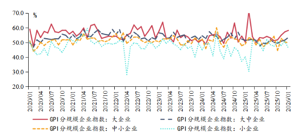 分企业规模来看,1月GPI调研结果显示,不同规模绿色环保企业景气度分化凸显,大型绿色环保企业景指数环比提升1.0个百分点,仍处于荣枯线之上;大中型绿色环保企业环比提高1.8个百分点至53.4%;中小型、小型绿色环保企业景气指数则较上月分别下降0.6和4.6个百分点,均落于收缩区间。(兴业研究 徐金、方琦、钱立华)
