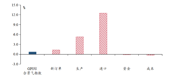从分项指数来看,供需方面,1月新订单指数较上月提高1.2个百分点,持续位于扩张区间;同时,1月生产指数环比提升5.0个百分点,进口指数亦环比提高12.5个百分点,绿色企业生产活动明显回暖。生产端的良好表现支撑1月GPI维持在扩张区间的主要动力。资金周转方面,1月资金指数仅微降0.1个百分点,仍处于荣枯线以上,显示出较强韧性。成本方面,1月成本指数环比下降了0.5个百分点,成本压力小幅缓解,结合PPI当月同比持续为负,1月指数仍处于历史较低区间,整体成本压力可控。