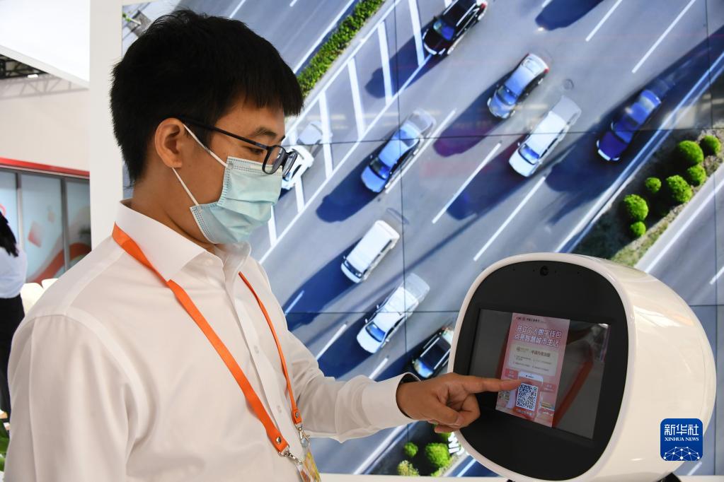 9月4日,在2021年中国国际服务贸易交易会首钢园区金融服务展馆,工作人员展示通过服务机器人办理数字人民币业务。